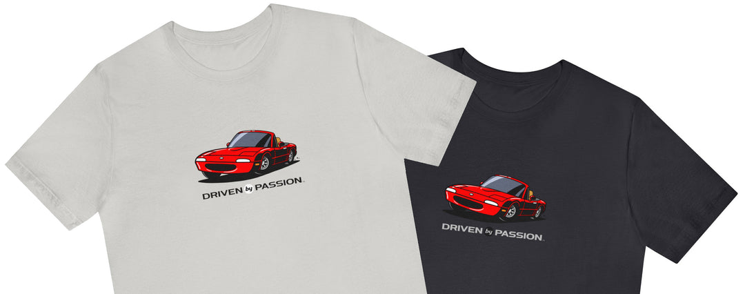 The light gray shirt highlights the full shape of the car and lets white details pop, while the dark gray shirt makes car colors truly stand out.